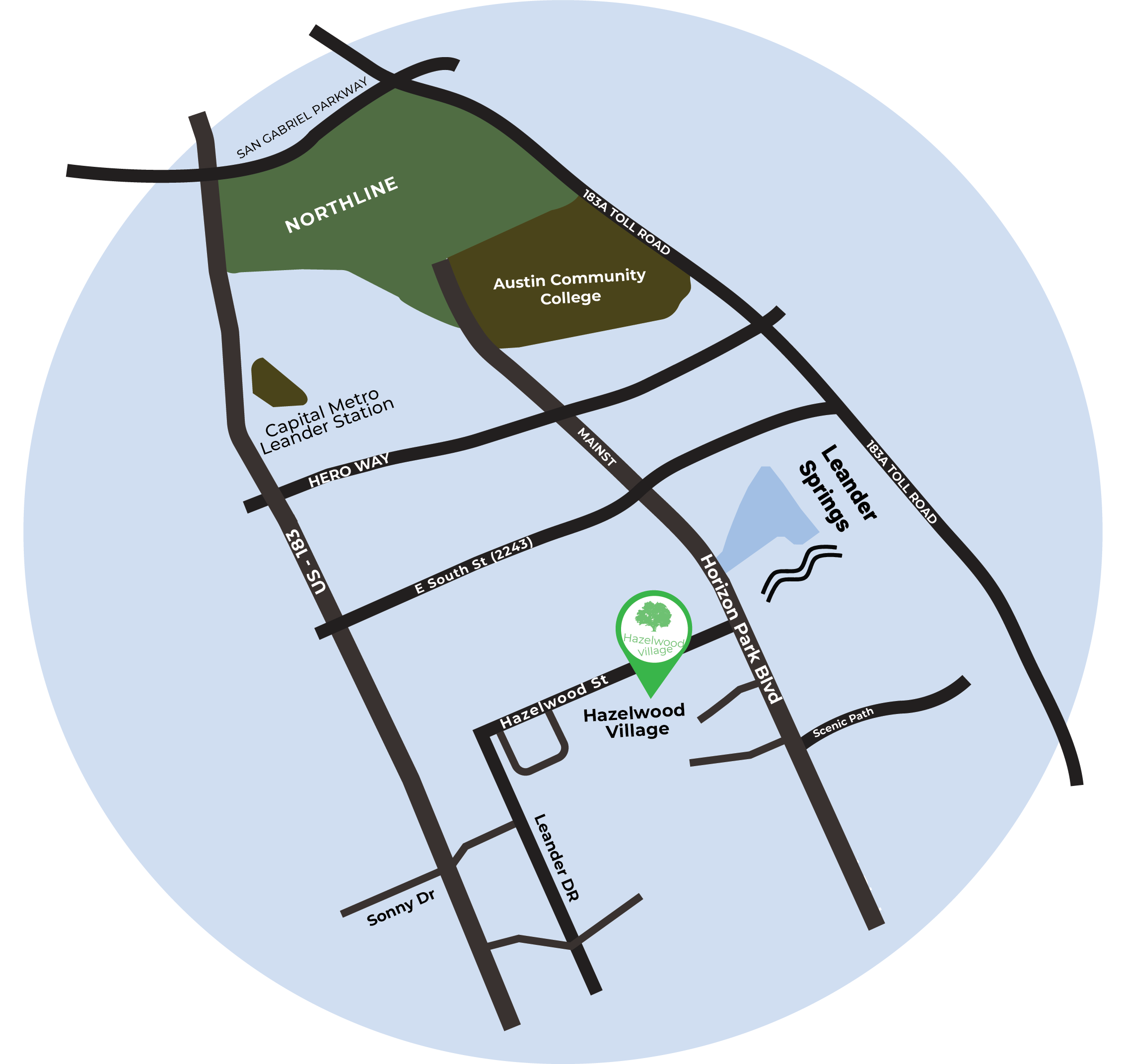 Situated in the heart of one of the fastest growing cities in the Nation, Hazelwood Village is located within minutes of major transportation hubs such as 183A Toll and Capital MetroRail, which links Leander's new Northline District with Austin CBD, Austin Community College and nine other stops in-between.